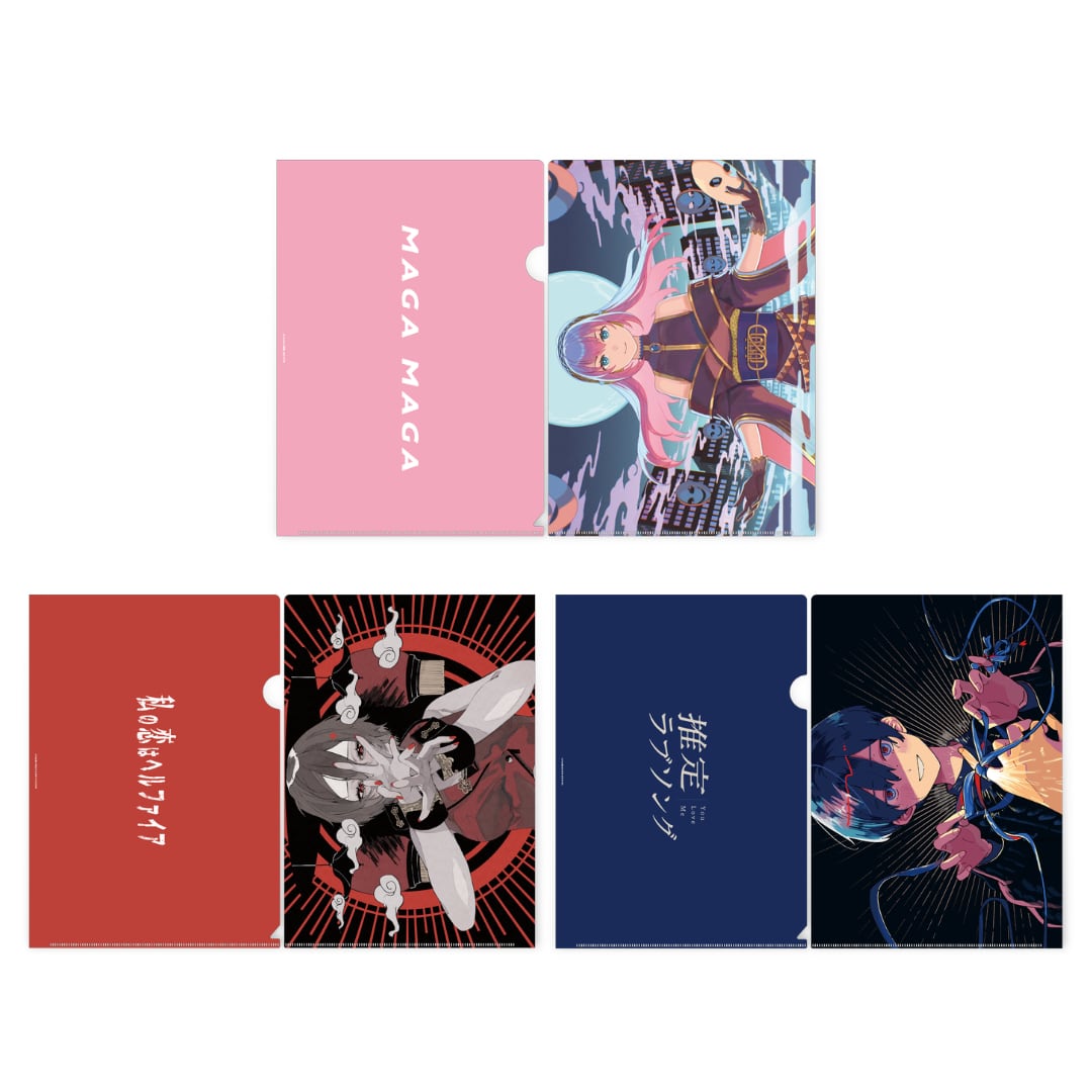 巡音ルカ、MEIKO、KAITOのAnniversaryを記念して制作された楽曲「MAGA MAGA」「私の恋はヘルファイア」「推定ラブソング」のMVイラストを使用したクリアファイルです。